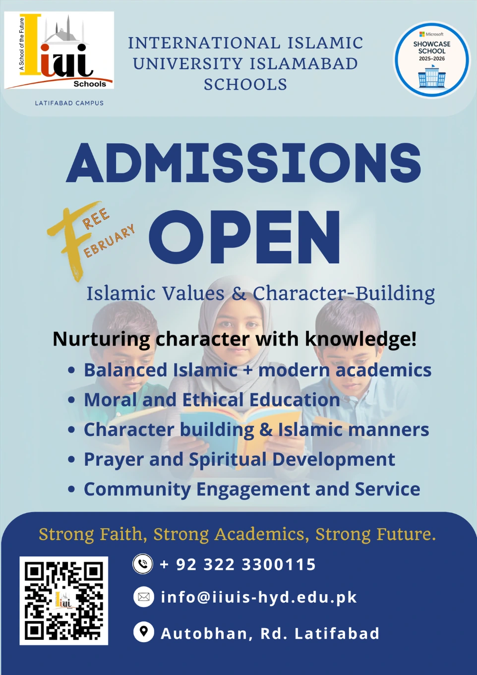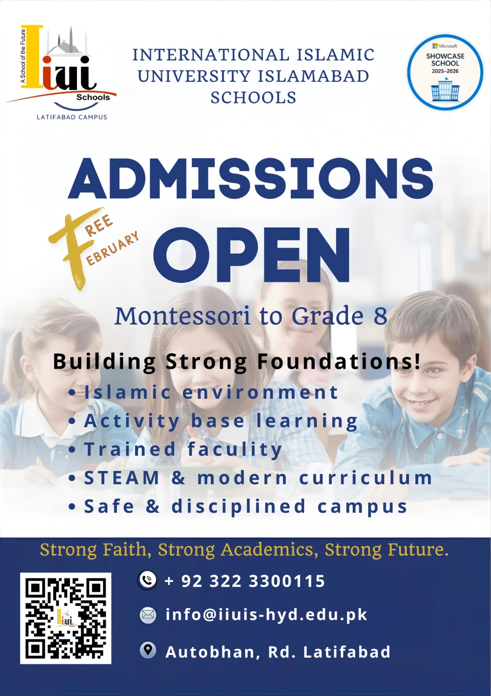 IIUI Schools Latifabad Campus is now welcoming new admissions for the 2026–2027 academic year! With a commitment to nurturing well-rounded learners, our campus offers a dynamic blend of tradition, innovation, and personalized growth.